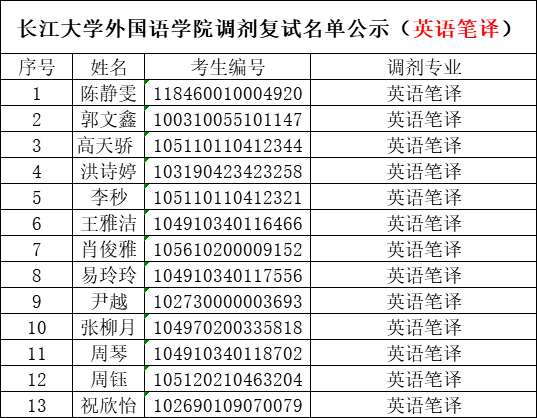 【调剂复试名单公示】九游游戏(中国)中心官方网站调剂复试名单公示(英语笔译)