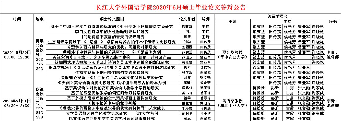 九游游戏(中国)中心官方网站2020年6月硕士毕业论文答辩公告