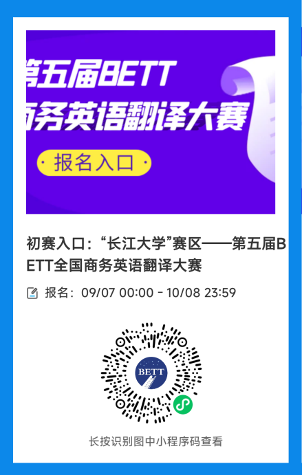 为提高在校大学生翻译及应用技能的积极性,在中国城市商业网点建设管理联合会指导下,由中国城商联外研分会主办的第五届BETT全国商务英语翻译大赛将于2023年10月中旬在长江大学举办初赛选拔赛。大赛初赛优异选手由组委会颁发荣誉证书,通过大赛初赛的选手可申领全国商务英语翻译BETT“初级笔译”或“初级口译”证书。大赛分为本科组和研究生组,分为口译和笔译两项赛事。