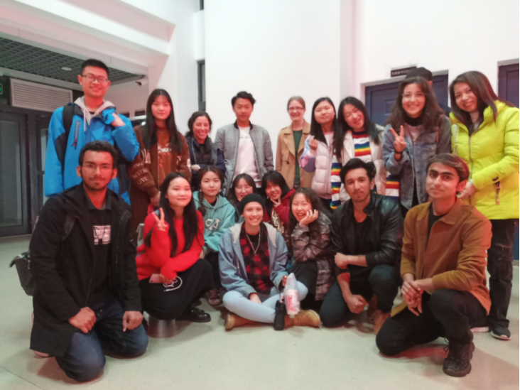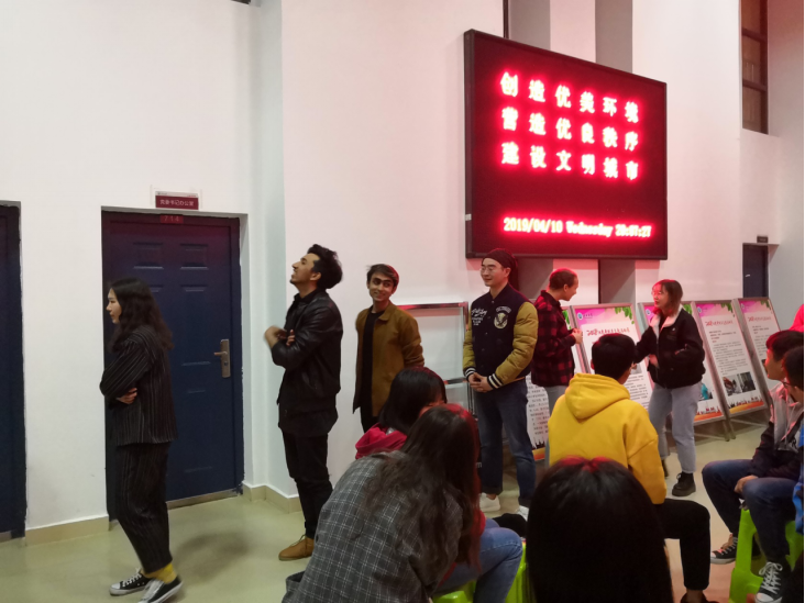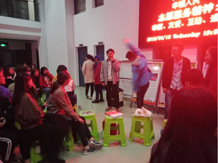 活动进行五十分钟时,,主持人宣布进入游戏环节。在场的同学和外教老师们都积极参加,根据主持人的提示将提示内容通过肢体语言传递给下一个同学。台上,参加游戏的同学和老师们做出一个个有趣的动作,生怕因为自己的动作不够生动形象使下一个参与者无法理解。有几个同学独创的“大猩猩”姿势更是让大家忍俊不禁。台下,同学们认真的看着参赛同学的表演,跟着一起猜提示词的同时又被台上同学的滑稽姿势逗的前仰后合