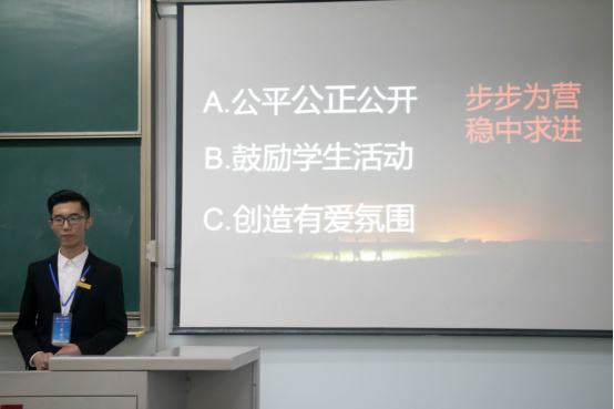 随后是我院学生会换届环节,竞选者们精心准备,身着正装。在规定时间内,各竞选人讲明自身具备的优势及对未来工作的打算。经过一番激烈角逐后,学生会成员进行投票,选出学生干部。