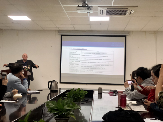 在第一场讲座上,皮姆教授首先以中国驻澳大使成竞业在“一带一路”论坛上的主旨演讲和中国政府文件的术语翻译引入主题——目标语读者对于翻译的接受度。