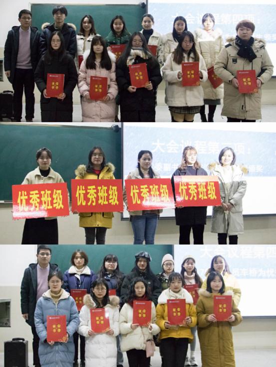 随后车桥老师作总结报告,他首先对上学期专业四级考试情况进行通报,对比学生考前的志向与考后的结果,比较差距。其次对2018-2019学年度回顾与总结,克服不足,发扬优点。并对关键问题进行提醒,严禁替考。回顾挂科情况,以及荣誉情况,表彰优秀学生干部。除了上学期的回顾,他还对本学期课堂考勤情况进行通报,对比各班级请假、迟到、旷到的情况。根据一学期的实际情况他指出日常管理中存在的问题,告诫同学们严禁在宿舍养宠物,并提醒同学们在冬天要高度重视宿舍的用电安全以及在期末之际要做好复习,诚信应考。在大会结束之际车老师对下学期的工作进行了安排与解读,对考研就业以及出国的同学分别提出了不同的建议,希望同学们在下学期做好自身的规划,栉风沐雨,砥砺前行。