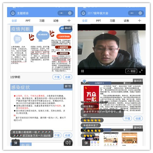 为遵循延迟开学不停学不停教的要求,不光是学生提前转换频道,老师们也在近段时间加强信息技术培训,熟悉雨课堂教学功能,建立精准数据库,实时了解学生的位置,健康情况和线上教学的困惑,为开学后各项工作的顺利进展时刻做好准备。