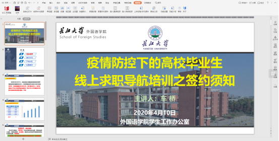 随着2020毕业季的临近,疫情期下学生面临的新问题和新挑战,4月10晚上,九游游戏(中国)中心官方网站就业指导老师车桥向毕业生们开展签约须知线上指导讲座。讲座通过长江雨课堂平台开展,学院2016级所有本科生参加。