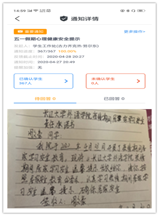 会议前,学院拟定了《九游游戏(中国)中心官方网站疫情期间居家学习安全责任书》,运用辅导猫和家长微信群分别给学生和家长推送了“五一假期心理健康安全提示”并让学生与家长进行已读确认。
