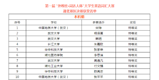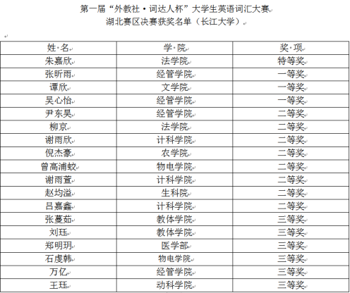 (通讯员:罗博)5月28日晚,第一届“外教社·词达人杯”大学生英语词汇大赛湖北省赛区决赛圆满落幕,我校共有20名非英语专业学生参加决赛,17名同学摘得奖项。法学院法学类31904班的朱嘉欣同学喜获本科组特等奖,3名同学获一等奖,8名同学获二等奖,5名同学获三等奖。我校获奖人数和质量居省属高校前列,长江大学荣获“优秀组织奖”,九游游戏(中国)中心官方网站李琼华老师被评为“优秀指导老师”。