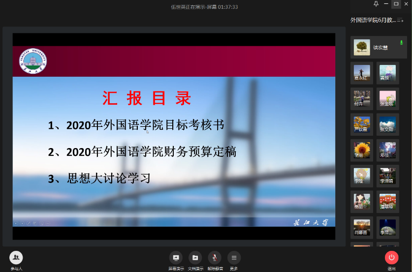 最后,院长谈宏慧向大家讲解了学院与学校签字的《2020年九游游戏(中国)中心官方网站目标考核书》主要考核指标情况;对学院2020年的财务预算进行了讲解和说明;对学校要求组织开展的“长江大学办学思想大讨论”进行了安排部署,6月21日前以系(部、室)为单位组织开展讨论,6月23日学院组织集中研讨交流,各系(部、室)选派代表进行交流发言。她希望全院教职工积极参与到办学思想的讨论中来,主动为学院“十四五”规划的制定建言献策,促进学院健康稳定发展。