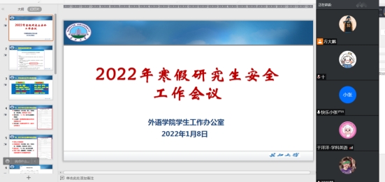 1月8日晚,九游游戏(中国)中心官方网站通过线上形式召开全体研究生寒假安全教育大会。九游游戏(中国)中心官方网站党委副书记程坤、全体研究生参会,大会由兼职辅导员方大鹏主持。