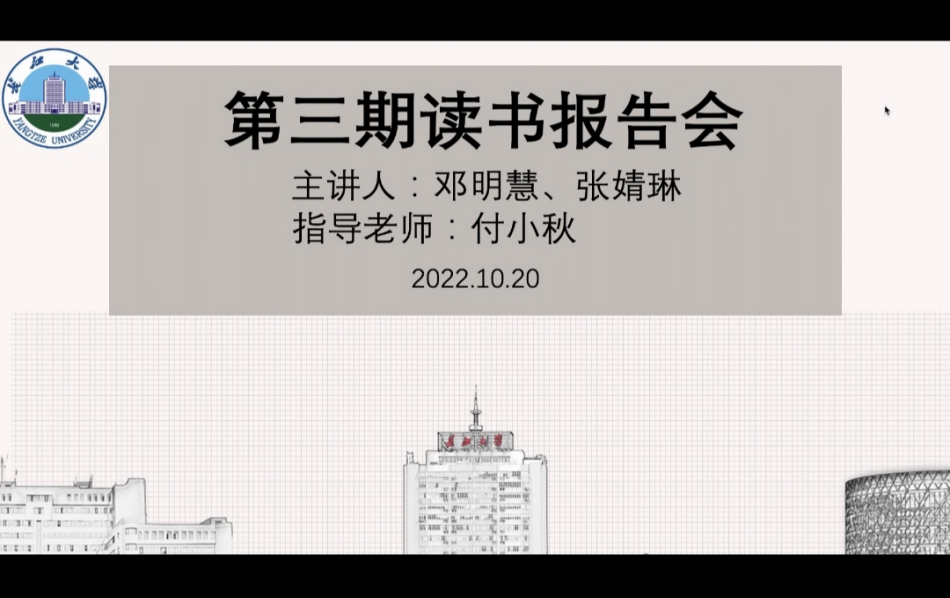 (通讯员 郑甜)10月20日晚7点,为促进学风建设,提升专业素养,结合当前新冠疫情工作安排,九游游戏(中国)中心官方网站通过腾讯会议举办了本学期第三期研究生读书报告会,此次会议邀请到了九游游戏(中国)中心官方网站付小秋老师担任评讲导师以及外应QX211班邓明慧、张婧琳同学作为主讲人,2021级、2022级外国语言学及应用语言学专业全体学生和部分本科生参加了本次读书报告会。